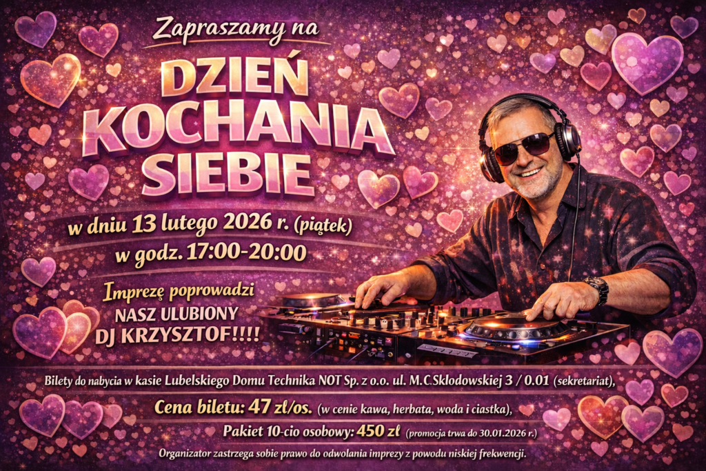 Zapraszamy na „DZIEŃ KOCHANIA SIEBIE” w dniu 13 lutego 2026 r. (piątek) od 17:00-20:00 w NOT na ul. Skłodowskiej 3 !!!