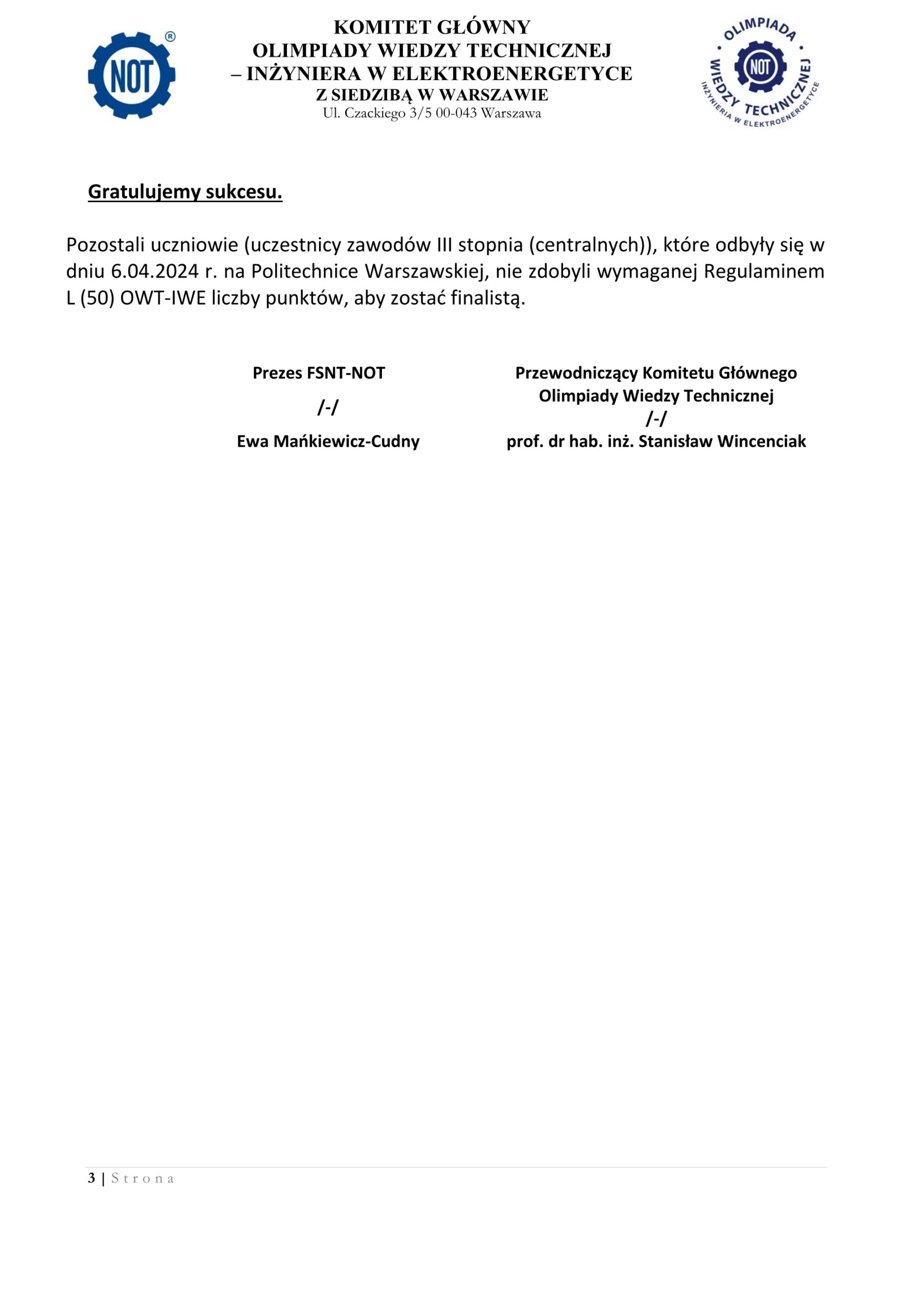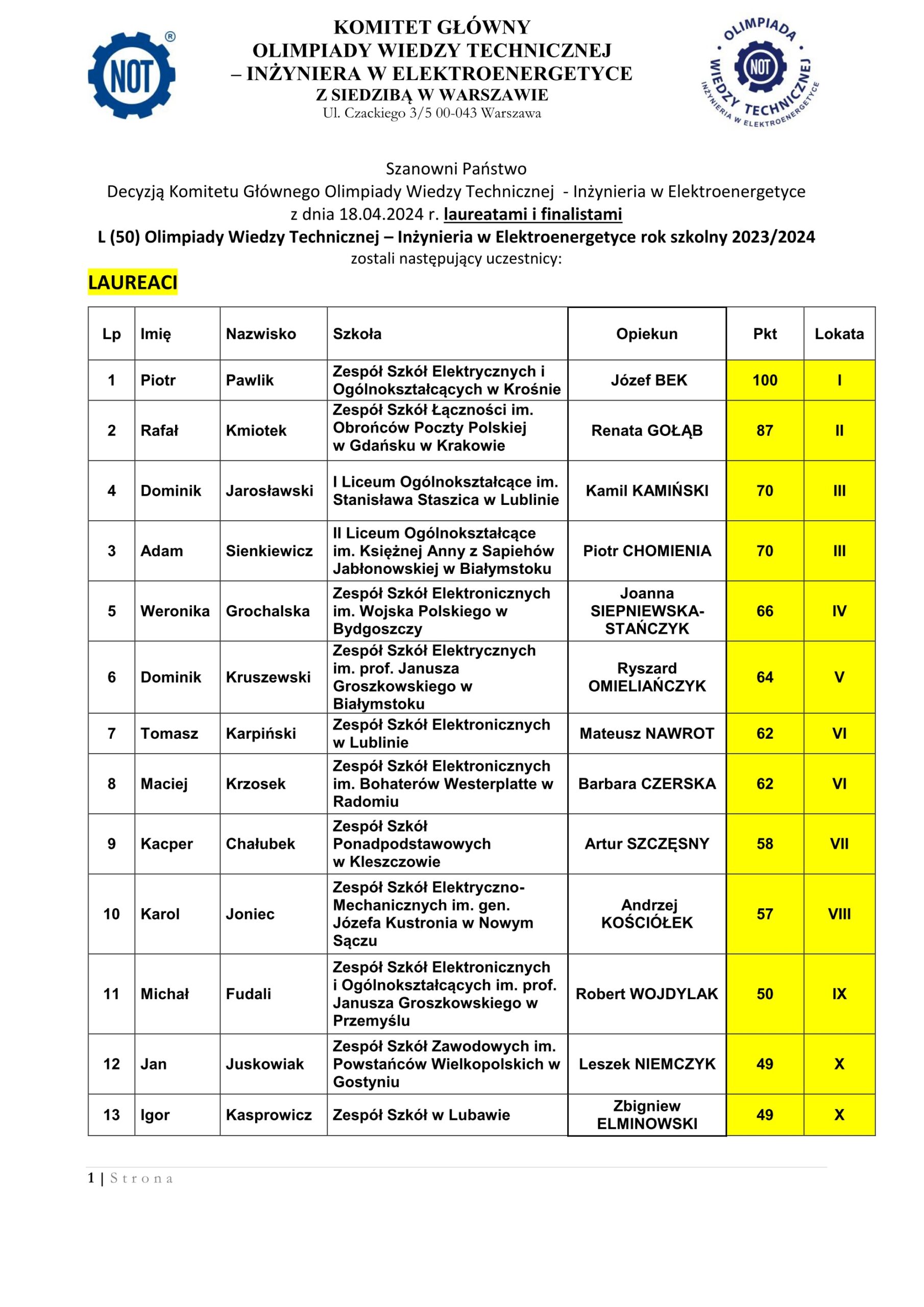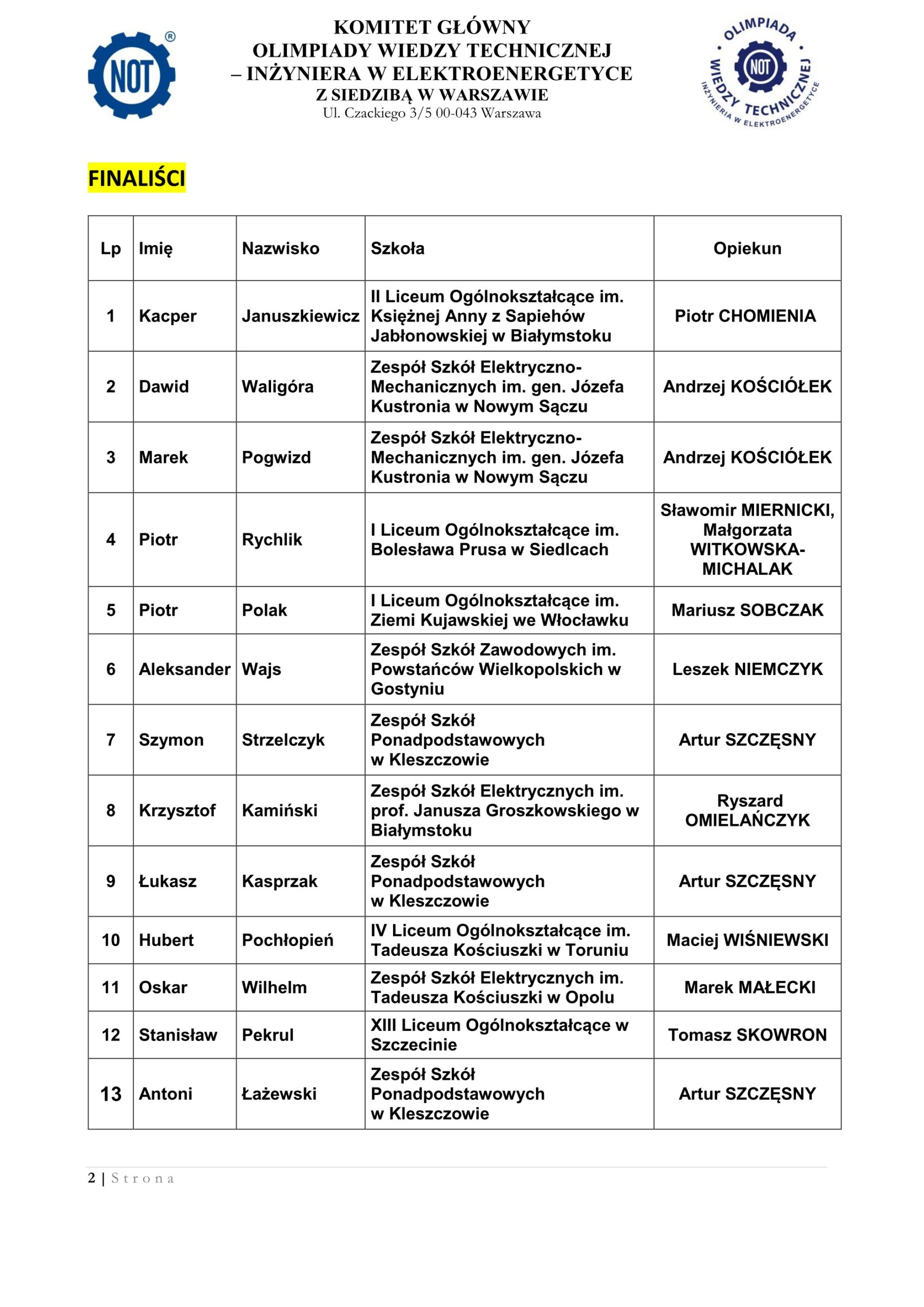 Uczniowie Zakwalifikowani do zawodów okręgowych (II Stopnia) 50 OWT – IWE