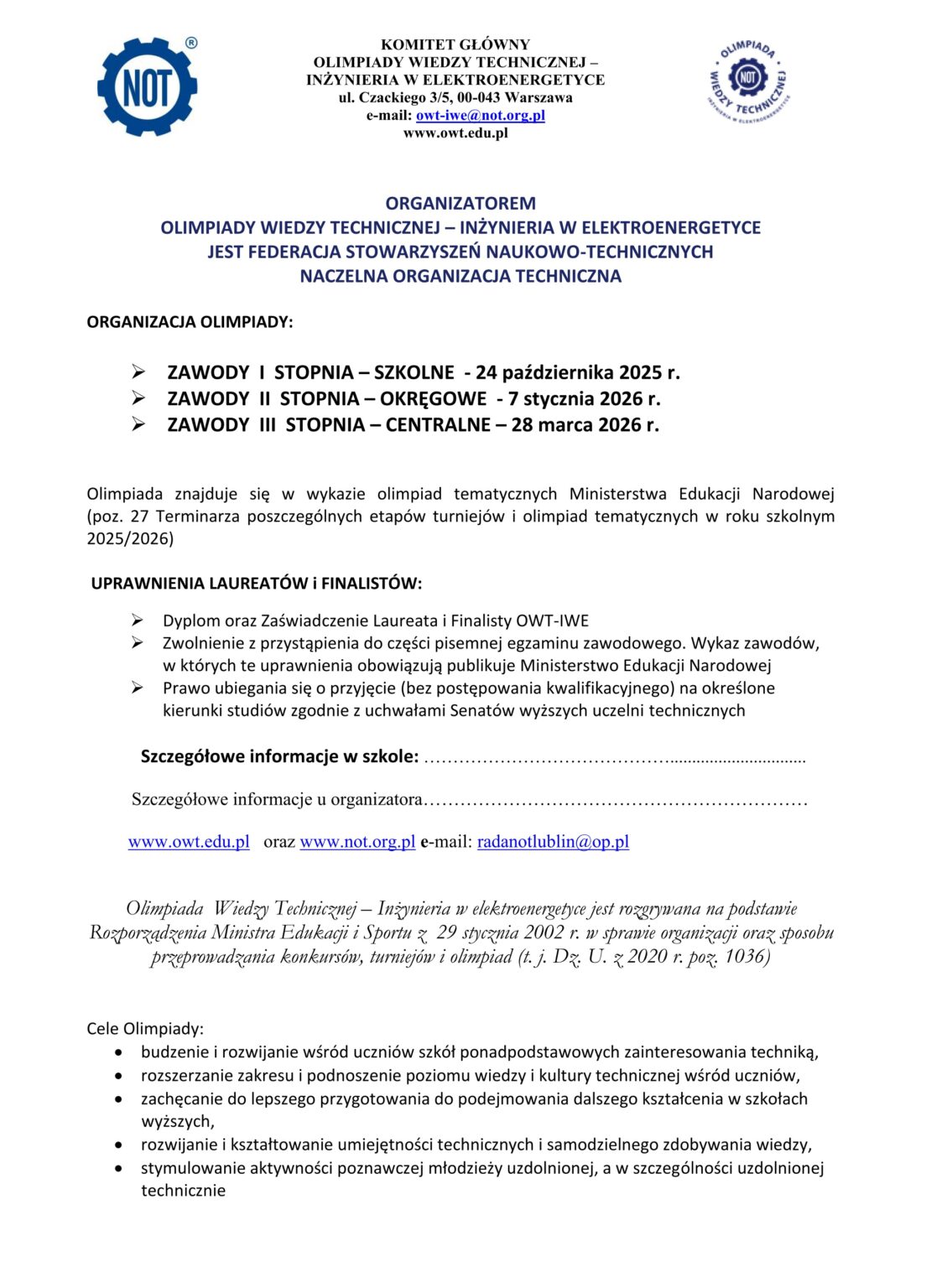 LISTA SZKÓŁ PONADPODSTAWOWYCH UCZESTNICZĄCYCH W ELIMINACJACH OKRĘGOWYCH II stopnia 51 EDYCJI OLIMPIADY WIEDZY TECHNICZNEJ – INŻYNIERIA W ELEKTROENERGETYCE (OWT-IWE).